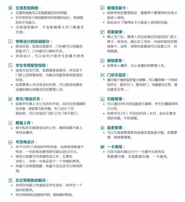 3044am永利集团专为学生公寓开发的无线联网的电子门锁,解决传统钥匙无法进行有效的信息化管理及普通宾馆锁无法联网的问题。实现远程批量授权,远程查询进出数据等,并配套可实现远程报警和远程开门管理。