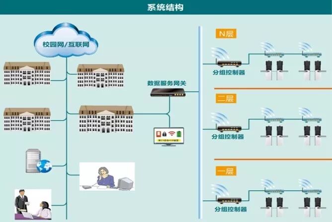 2.门锁采用双电源供电模式,每楼层采用数据网关集中统一供电,专用电源平时用市电变压后供本层门锁使用,并自带备用电池,当校区停电时自动切换到干电池供电模式,采用集中统一供电,施工成本较高、且需要提前在门内预留走线管道,但这种模式的好处是大大节省了后期维护更换电池的成本和人工成本。