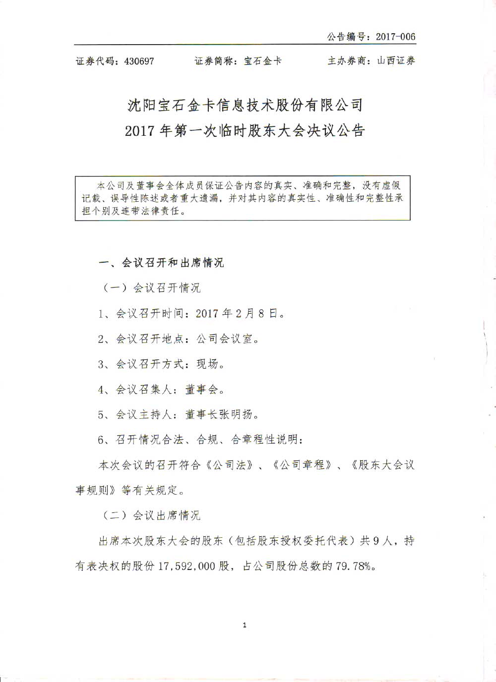 2017年第一次临时股东大会决议公告